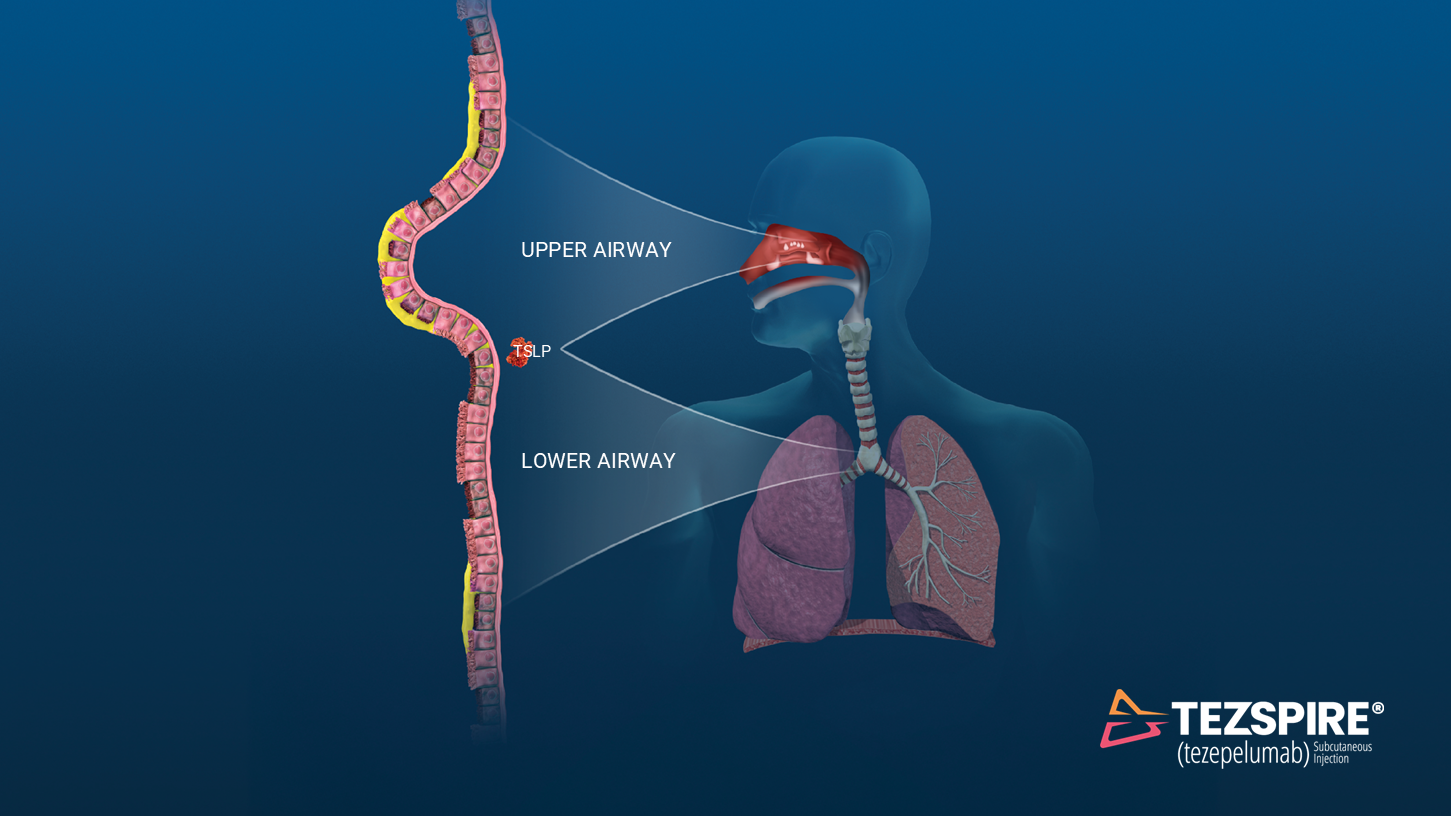 Tezspire är det första och enda läkemedel blockerar det epiteliala cytokinet TSLP (thymiskt stromalt lymfopoietin). Tezepelumab är en monoklonal antikropp som är riktad mot TSLP och hindrar interaktion med TSLP-receptorn. Blockering av TSLP med Tezspire reducerar nivån av ett brett spektrum av biomarkörer och cytokiner som förknippas med luftvägsinflammation såsom blodeosinofiler, eosinofiler i luftvägsslemhinnan, IgE, FeNO, IL‑5 och IL‑13.1